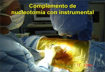Con el nucleótomo se aspira y se extrae la hernia y los fragmentos mayores se pueden retirar con instrumental artroscópico bajo visión radioscópica.