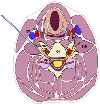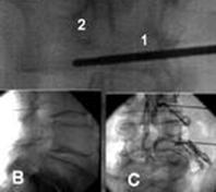 Con el paciente en decúbito supino y el cuello en ligera hiperextensión, se realizan 4 movimientos con el arco de rayos (Rx). Con el Rx en posición lateral, se identifica el nivel que se va a tratar. Cuando se ha identificado, se realiza un movimiento del Rx en posición oblicua hasta que se visualiza el foramen completamente. Cuando el foramen se ve claramente, se realiza un movimiento craneocaudal para eliminar el doble contorno del agujero que se va a tratar. Por último, con una proyección anteroposterior, se debe visualizar la punta de la aguja en la porción media de la articulación facetaria.