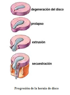 Hay cuatro etapas en la formación de una hernia de disco, como se puede ver a continuación: