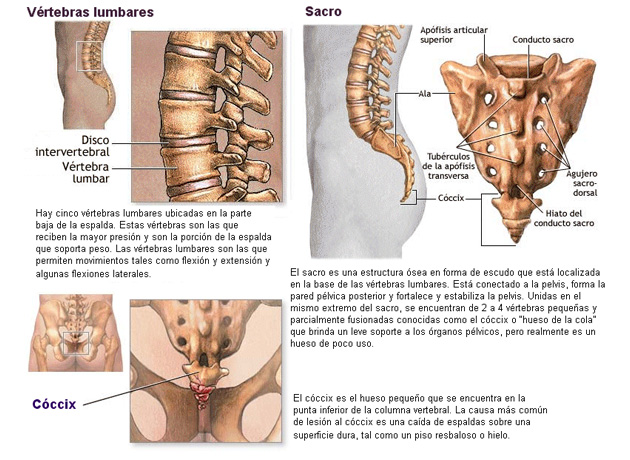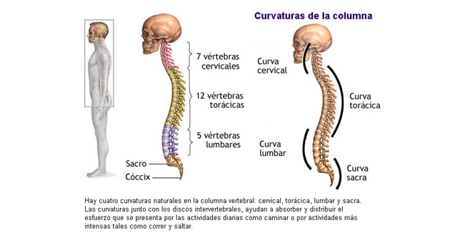 La columna vertebral está dividida en varias secciones. Las 7 vértebras cervicales forman el cuello. Las 12 vértebras torácicas comprenden la porción del tórax y tienen costillas adheridas a ellas. Las 5 vértebras lumbares son las vértebras restantes que están por debajo del último hueso torácico y en la parte superior del sacro. Las vértebras sacras están rodeadas por los huesos de la pelvis y el cóccix representa las vértebras terminales.