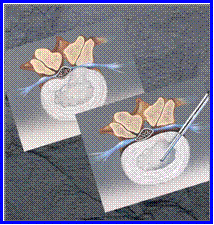 - No es necesario ingresar al conducto raquídeo, ya que, la entrada es a 8 cm. de la línea media y se llega directamente al disco.
